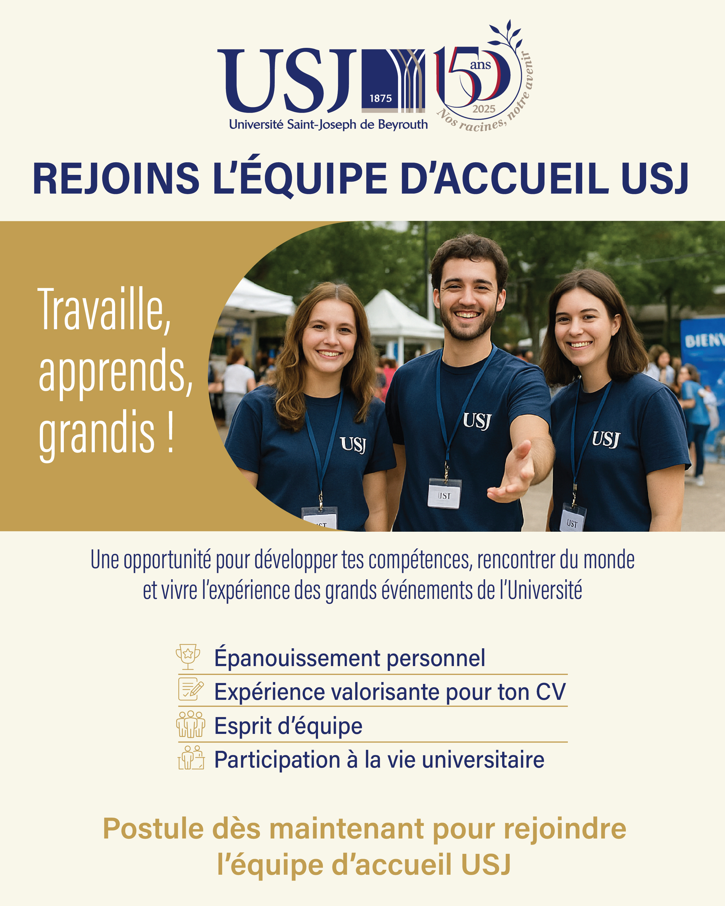 défaut Attention : l’exécution de JavaScript est désactivée dans votre navigateur ou sur ce site. Vous risquez de ne pas pouvoir répondre à toutes les questions. Veuillez vérifier les paramètres de votre navigateur. Équipe d'accueil (Cette question est obligatoire) Nom Prénom (Cette question est obligatoire) Matricule étudiant Seuls des chiffres peuvent être saisis dans ce champ (Cette question est obligatoire) E-mail USJ Veuillez vérifier le format de votre réponse Veuillez vérifier le format de votre réponse. Téléphone Seuls des chiffres peuvent être saisis dans ce champ (Cette question est obligatoire) Institution Veuillez sélectionner une réponse ci-dessous Veuillez choisir ... Aumônerie USJ Banque libanaise de tissus humains Berytech pôle technologique Bureau administratif de Paris Bureau de l’USJ - Amérique du Nord Bureau des anciens étudiants de l’USJ Bureau des assurances Bureau d'inclusion Bureau du recteur Campus Charles Corm Campus de l'innovation et du sport Campus de Zahlé et de la Békaa Campus des sciences et technologies Campus des sciences humaines Campus des sciences médicales Campus des sciences sociales Campus du Liban Nord Campus du Liban Sud Campus-J Catholic Relief Service Centre professionnel de médiation Chaire Amérique Latine Chaire de “Fondation Diane” pour l’éducation à l’éco-citoyenneté et au développement durable Chaire de management de la sécurité routière, Fondation Renault-Université Saint-Joseph de Beyrouth Chaire de recherche sur les déplacements forcés au Moyen-Orient Chaire d'études phéniciennes Chaire Louis D. Institut de France d'anthropologie interculturelle Chaire Senghor de la Francophonie Chaire UNESCO d'études comparées des religions, de la médiation et du dialogue Chaire Youakim Moubarac Chœur de l’USJ Collaborative Network for Carrier Building Training and E-Learning École de sages-femmes École de traducteurs et d'interprètes de Beyrouth École des techniciens de laboratoire d'analyses médicales École libanaise de formation sociale Ecole supérieure d'architecture de Beyrouth École supérieure d'ingénieurs agroalimentaires École supérieure d'ingénieurs d'agronomie méditerranéenne École supérieure d'ingénieurs de Beyrouth Éditions de l'Université Saint-Joseph Enseignement interdépartemental ESMOD - École supérieure des arts et techniques de la mode EUMED Cities Faculté de droit et des sciences politiques Faculté de gestion et de management Faculté de langues et de traduction Faculté de médecine Faculté de médecine dentaire Faculté de pharmacie Faculté de sciences économiques Faculté des lettres et des sciences humaines Faculté des sciences Faculté des sciences de l'éducation Faculté des sciences infirmières Faculté des sciences religieuses Faculté d'ingénierie et d'architecture Fédération des amicales étudiantes de l'USJ Fédération des associations des anciens de l'USJ Fondation USJ Foyer de Bramieh Garderie Saint-Joseph Hôtel-Dieu de France Institut Confucius Institut de gestion des entreprises Institut de lettres orientales Institut de physiothérapie Institut de psychomotricité Institut d'ergothérapie Institut des sciences politiques Institut d'études islamo-chrétiennes Institut d'études scéniques audiovisuelles et cinématographiques Institut libanais d'éducateurs Institut national des télécommunications et de l'informatique Institut supérieur de santé publique Institut supérieur de sciences religieuses Institut supérieur des sciences de l'assurance Institut supérieur d'études bancaires Institut supérieur d'orthophonie La Bibliothèque Orientale Musée de Préhistoire libanaise Observatoire de la fonction publique et de la bonne gouvernance Observatoire des langues / Arabe et compagnie Observatoire universitaire de la réalité socio-économique Observatoire universitaire de l'enfance et de la jeunesse au Liban Opération 7e jour Pôle technologie santé Presses de l'Université Saint-Joseph Proche Orient Chrétien Quartier jésuite Recherche et Développement SARL Rectorat Résidence des jésuites Résidence USJ Restaurant Secrétariat général Service comptable Service d'aide psychologique Service de la vie étudiante Service de l'insertion professionnelle Service de maintenance et de conservation du patrimoine immobilier Service de technologie de l'information Service des achats et des approvisionnements Service des publications et de la communication Service des ressources humaines Service des tests d'aptitude Service du sport Service étudiant d'information et d'orientation Service financier Service social Théâtre Béryte Théâtre Monnot Unité assurance qualité Université pour tous Université Saint-Joseph - Campus de Dubaï Université Saint-Joseph de Beyrouth USJ - Activités USJ Mentor Unit USJ sans frontières USJ Université d'été USJ-ENPI ECOPLANTMED USJ-ENPI GREAT MED Vice-rectorat à la recherche Vice-rectorat à l'administration Vice-rectorat aux affaires académiques Vice-rectorat aux relations internationales (Cette question est obligatoire) Cursus (Cette question est obligatoire) Niveau Veuillez sélectionner une réponse ci-dessous Master Licence (Cette question est obligatoire) Année d'études Veuillez sélectionner une réponse ci-dessous Veuillez choisir ... 1ère 2ème 3ème 4ème 5ème Autre : Autre : Envoyer Veuillez confirmer que vous souhaitez effacer vos réponses ? Sortir et effacer vos réponses
