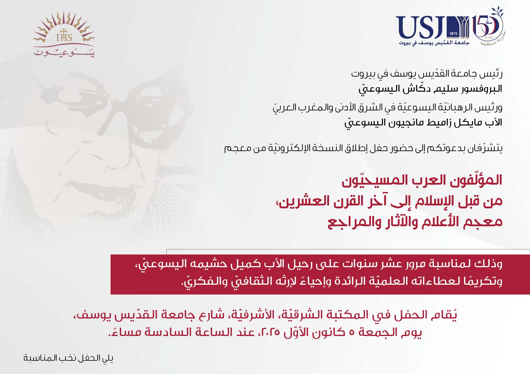 défaut Attention : l’exécution de JavaScript est désactivée dans votre navigateur ou sur ce site. Vous risquez de ne pas pouvoir répondre à toutes les questions. Veuillez vérifier les paramètres de votre navigateur. Cérémonie en hommage au Père Camille Hechaïmé, S.J. (Cette question est obligatoire) Je confirme ma présence à la Cérémonie Je regrette de ne pas pouvoir être présent Envoyer Veuillez confirmer que vous souhaitez effacer vos réponses ? Sortir et effacer vos réponses